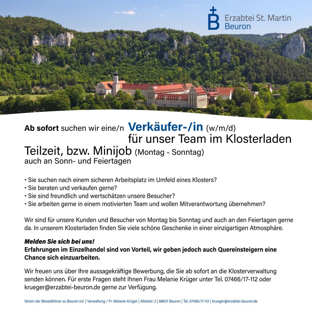 Aktuell suchen wir eine/n Verkäufer-/in für unser Team im Klosterladen und freuen uns auf Ihre Bewerbung an Frau Melanie Krüger unter